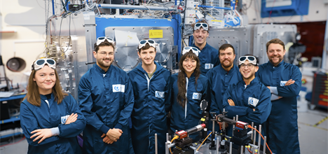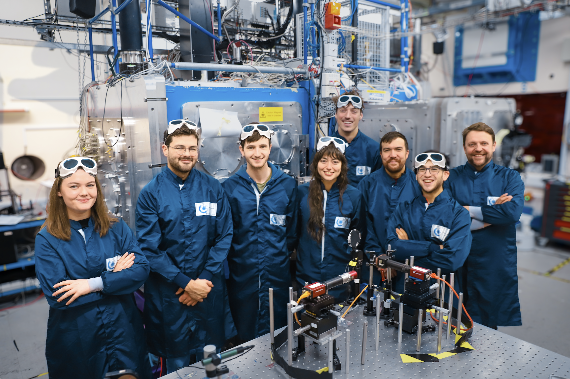 Some members of the experimental team in the Gemini laser target area. In the background is the Gemini target chamber. From the left the team members are Holly Huddleston, Dr Jonny Kennedy, Dr Colm Fitzpatrick, Dr Robin Timmis, Elliott Denis, Dr Mark Yeung, Jeremy Rebenstock and Professor Brendan Dromey. Credit: CLF