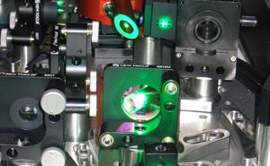 The oscillator is a commercial product made by Femtolasers. A Titanium doped sapphire (TiS) crystal is pumped by 5.5 Watts of 532 nm green light from a frequency-doubled, diode-pumped neodymium vanadate (Nd:YVO4) laser.
